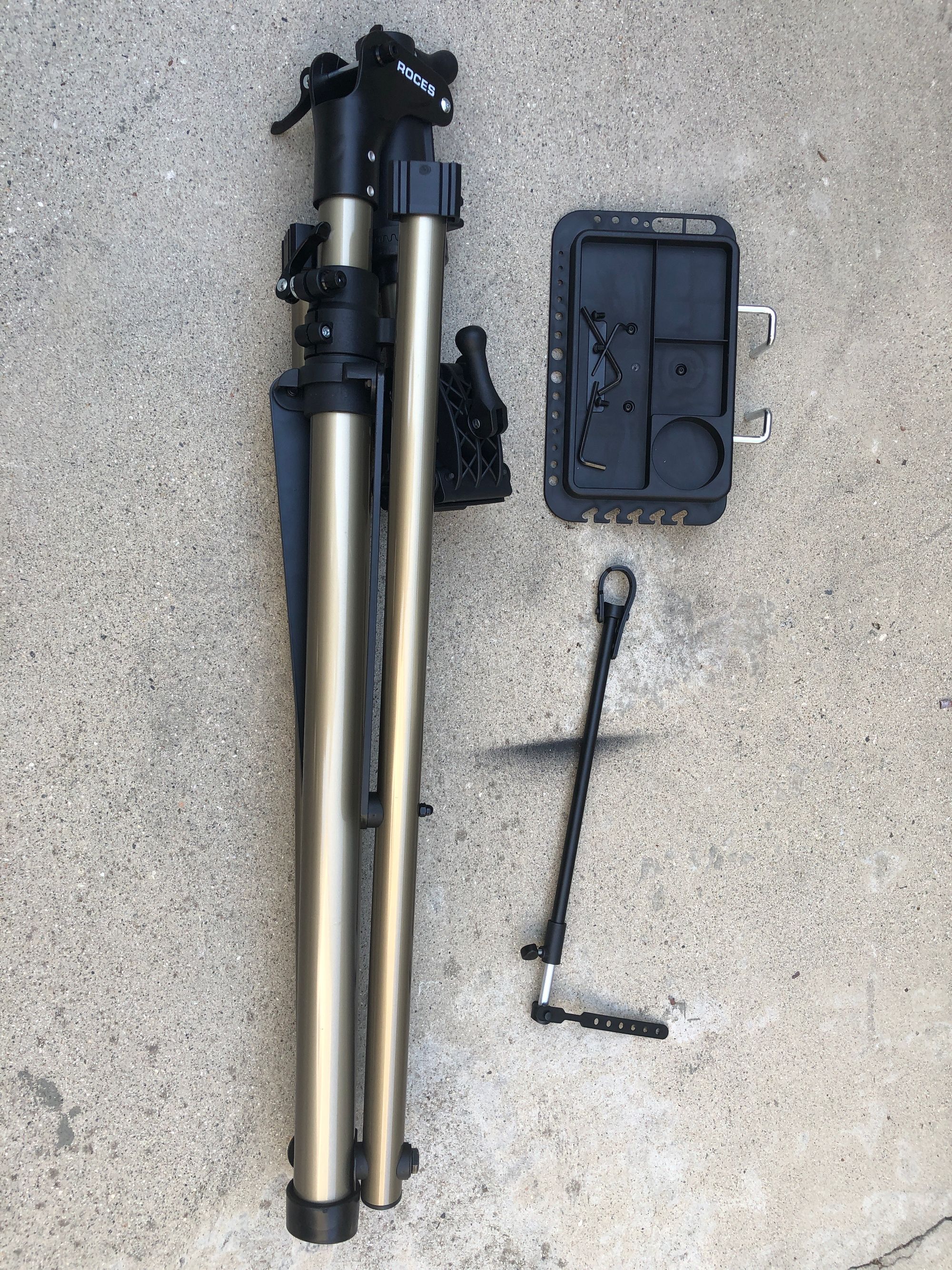 My first impression of this stand is that it looks and feels pretty sturdy. While the frame is made of aluminum, all the clamps and fixtures are plastic. The aluminum tubing is pretty thick and build quality seems solid, but time will tell. The stand is foldable so it makes storage and transport convenient. It comes with a tool/parts tray that is easily removable along with an adjustable rod to hold the front wheel steady if needed.
